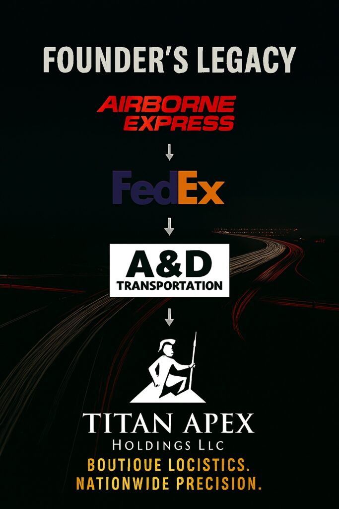 For over 30 years, Titan Apex Holdings LLC has redefined what logistics means. Built from the ground up by Corey Robinson—an industry veteran with roots in Airborne Express, FedEx, and A&D Trucking—Titan Apex blends white-glove precision with black-glove grit to deliver a premium logistics experience unlike any other.